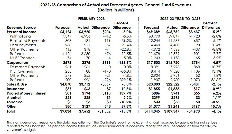 For the 2022-23 fiscal year through February 28, revenues are now $4.7 billion (4.1%) below the administration’s January budget projections, including income taxes, sales taxes, and various other tax, fee, and miscellaneous revenue sources.